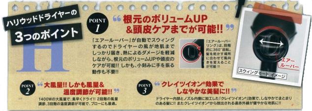 風が自動でスウィングする革新的ドライヤー登場!! 憧れの海外セレブのような“セクシーなボリューム”と“しなやかな質感”に!! 『ハリウッドドライヤーの3つのポイント』 ★根元のボリュームUP&頭皮ケアまでが可能 「エアールーバー」が自動でスウィングするのでドライヤーの風が地肌までしっかり届き、熱によるダメージを軽減しながら、根元のボリュームUPや頭皮のケアが可能!しかも、小刻みに手を振る動作も不要! ★大風量!しかも風量&温度調節が可能! 1400Wの大風量で、素早くドライ!2段階の風量調節、3段階の温度調節が可能で、ブローにも最適。 ★クレイツイオン効果でしなやかな美髪に! ドライヤー内部とノズル内側に加工したクレイツイオン効果で、しなやかでまとまりのある髪に! またクレイツイオンから放出される遠赤外線が健やかな地肌に!