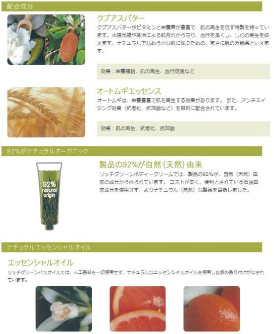 リッチグリーンボディークリームでは、製品の92%が、自然(天然)由来の成分から作られています。