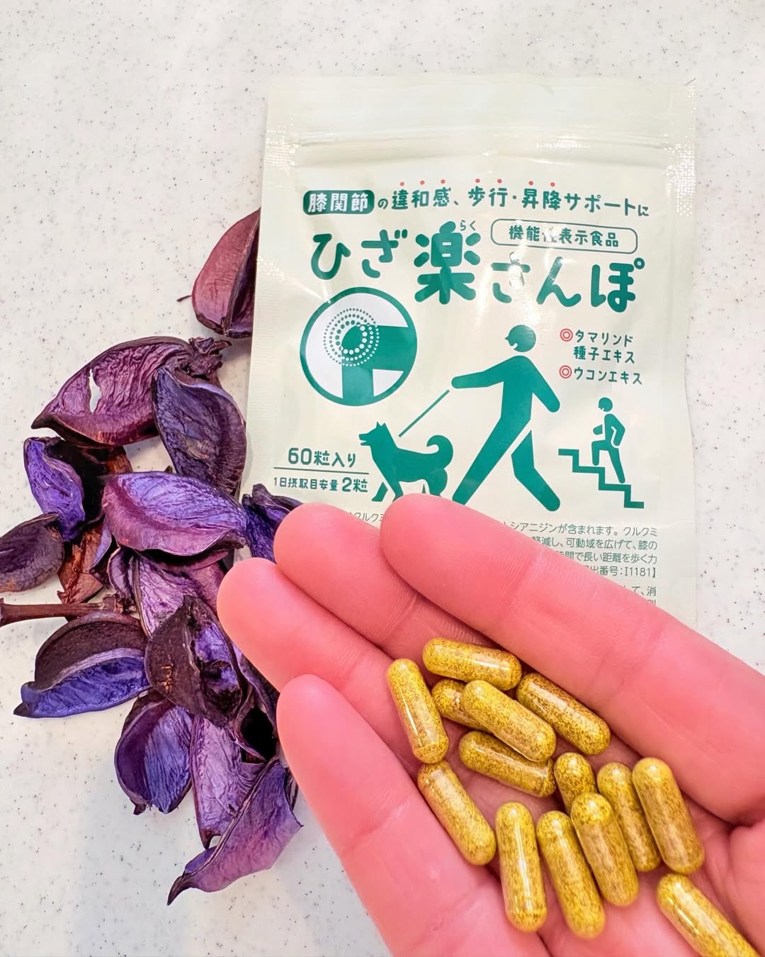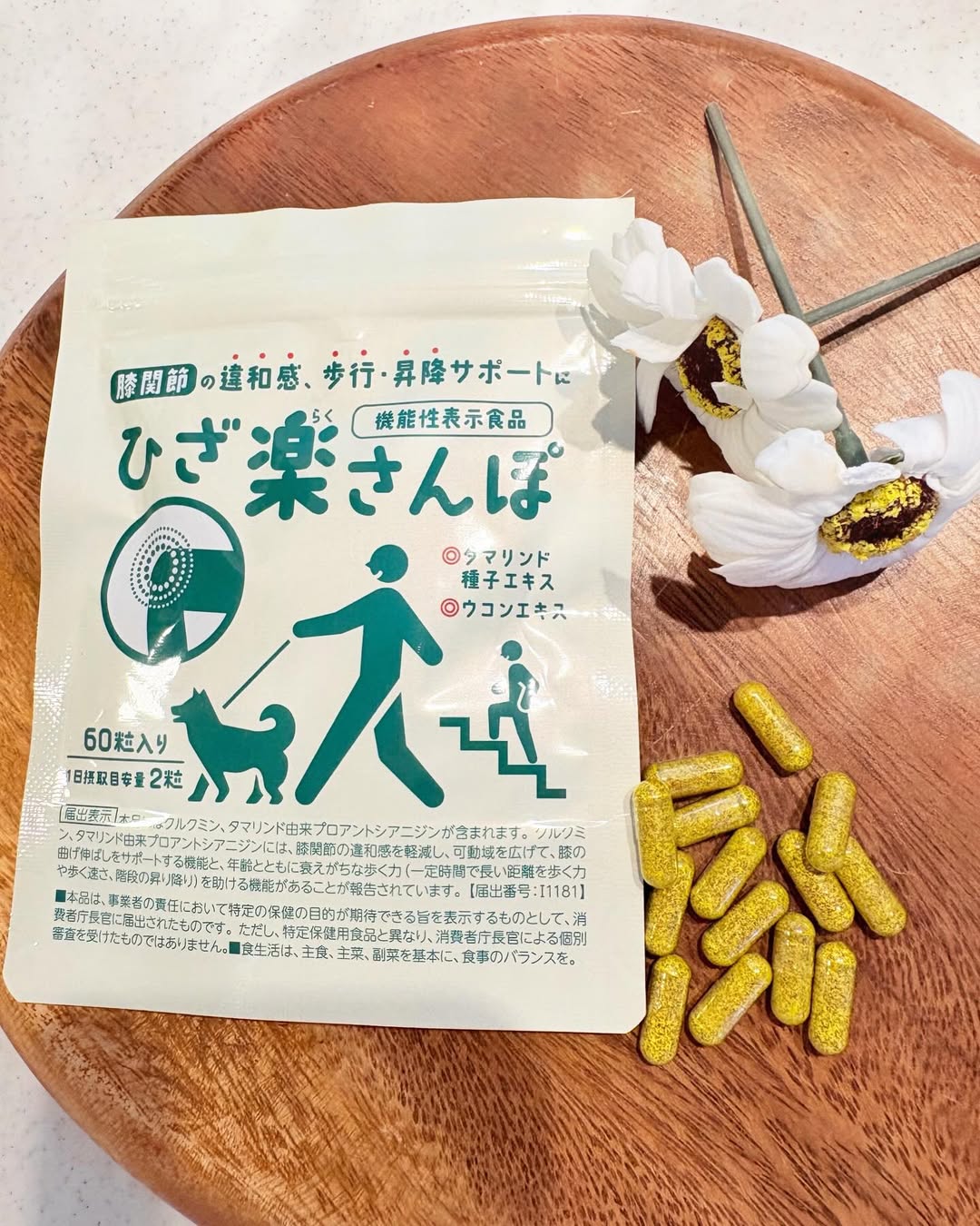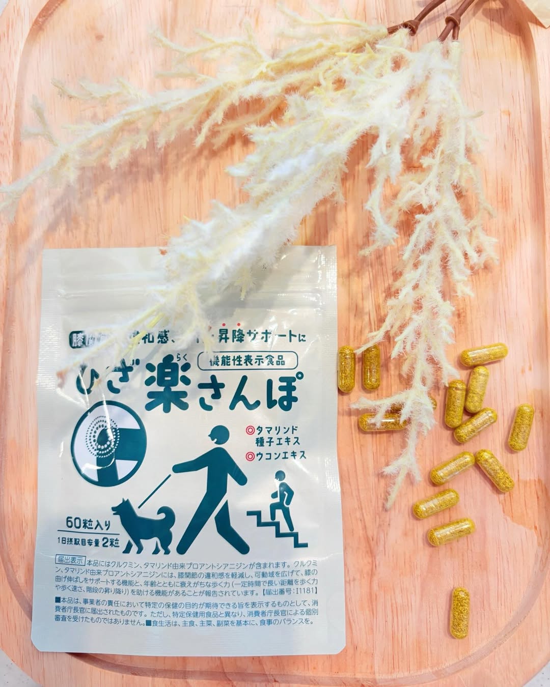 機能性表示食品 ひざ楽さんぽ<br> 内容量:60粒(1日2粒目安-約1ヵ月分)<br> えっ、たった14日で!? ヒザのツラさを和らげ、可動域を広げる、ヒザ関節の強いミカタ! 曲げ伸ばし・歩行・階段の昇り降りのサポートに! ~こんな方におすすめ~ □実感までに何ヵ月もかかるのはイヤ □立ち上がるときがつらい □階段の昇り降りがつらい □長い距離を歩くのがきつい □膝の可動域を広げたい ーーーーーーーーー-ーーーーーーーーーーーーーーーーーーーーーーーーーーーーーーー 【機能性関与成分】 タマリンド由来プロアントシアニジン、クルクミン 【届出表示機能】 本品にはクルクミン、タマリンド由来プロアントシアニジンが含まれます。クルクミン、タマリンド由来プロアントシアニジンには、膝関節の違和感を軽減し、可動域を広げて、膝の曲げ伸ばしをサポートする機能と、年齢とともに衰えがちな歩く力(一定時間で長い距離を歩く力や歩く速さ、階段の昇り降り)を助ける機能があることが報告されています。