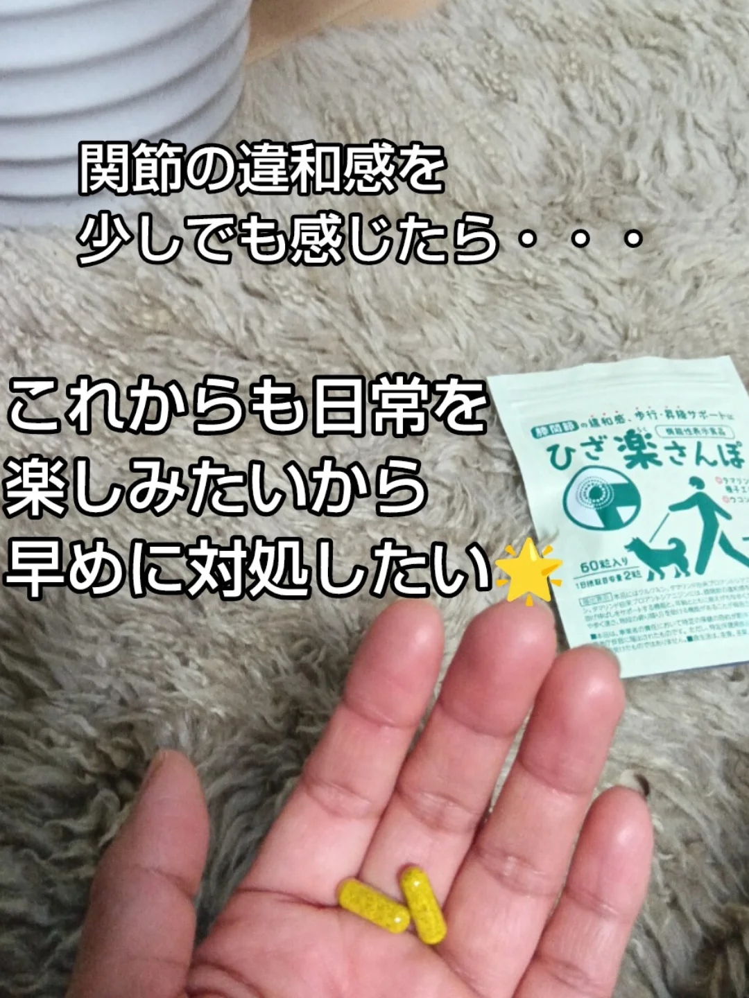 機能性表示食品 ひざ楽さんぽ<br> 内容量:60粒(1日2粒目安-約1ヵ月分)<br> えっ、たった14日で!? ヒザのツラさを和らげ、可動域を広げる、ヒザ関節の強いミカタ! 曲げ伸ばし・歩行・階段の昇り降りのサポートに! ~こんな方におすすめ~ □実感までに何ヵ月もかかるのはイヤ □立ち上がるときがつらい □階段の昇り降りがつらい □長い距離を歩くのがきつい □膝の可動域を広げたい ーーーーーーーーー-ーーーーーーーーーーーーーーーーーーーーーーーーーーーーーーー 【機能性関与成分】 タマリンド由来プロアントシアニジン、クルクミン 【届出表示機能】 本品にはクルクミン、タマリンド由来プロアントシアニジンが含まれます。クルクミン、タマリンド由来プロアントシアニジンには、膝関節の違和感を軽減し、可動域を広げて、膝の曲げ伸ばしをサポートする機能と、年齢とともに衰えがちな歩く力(一定時間で長い距離を歩く力や歩く速さ、階段の昇り降り)を助ける機能があることが報告されています。