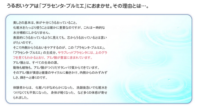 豚と比べて約300倍ものアミノ酸が含まれているこの『プラセンタ・プルミエ-潤瑠-』。いつまでも美しくいたい、そんな女性の願いをカタチに!