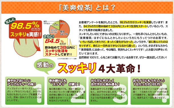 毎日スッキリ出ない…ってお悩み、実はとっても多いんです。 『美爽煌茶』はアップルティーを美味しく飲むだけでスッキリ! お腹も痛くなりくく、身体に慣れにくいのでず~っとスッキリが続くんです。 実感力が違います!! フレージュの専属茶師が美味しく仕上げた自然素材100%の大人気の健康茶、 ぜひお試しください♪ レビュー数 : 413 |