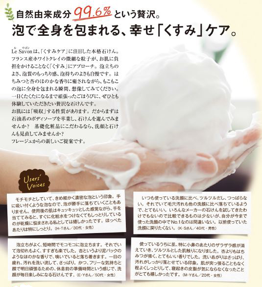 『Le Savon』は「くすみケア」に注目した本格石けん。フランス産ホワイトクレイの微細な粒子が、お肌に負担をかけることなく「くすみ」にアプローチ。他にも毛穴・ひきしめケアにいいユキノシタエキス、エイジングケアに必要不可欠なビタミンC誘導体も配合。泡立ちのよさ、泡質のもっちり感、泡持ちのよさも自慢です。はちみつと杏のほのかな香りに癒されながら、もこもこの泡に全身を包まれる瞬間、想像してみてください。一日くたくたになるまで頑張ったごほうびに、ぜひとも体験していただきたい贅沢な石けんです。