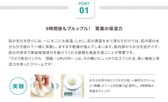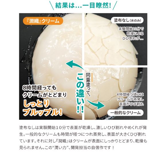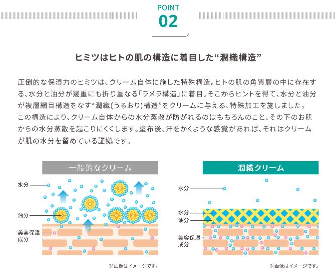 乾燥が進み、肌のバリア構造が乱れると、紫外線等の外的刺激をより受けやすくなり、シワやシミ、肌荒れの加速に繋がります。『潤織』は、その原因と向き合い開発された圧倒的な潤い力を持つ、シワ改善・美白*クリームです。クリーム自体の構造として水分と油分を網目状に折り重ねる特殊技術を採用、肌の上にもう一枚肌をまとうような新感覚で、ぷるぷるのハリ肌へと導きます。