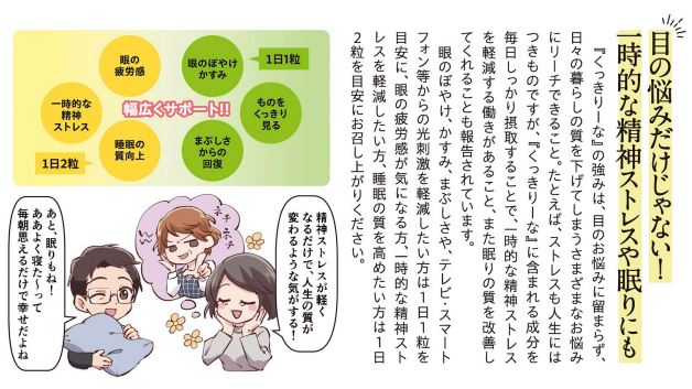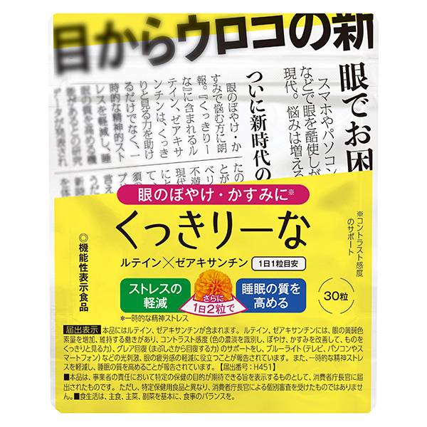 1日中疲れ目で、目の奥がず~んと重い、雑誌の文字がぼやけて見えない、テレビやスマートフォンの画面がまぶしくてつらい…。さまざまな眼のお悩みにまとめてお応えするのが『くっきりーな』です!!