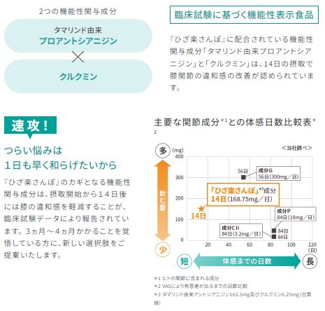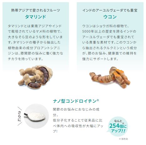 本品にはクルクミン、タマリンド由来プロアントシアニジンが含まれます。クルクミン、タマリンド由来プロアントシアニジンには、膝関節の違和感を軽減し、可動域を広げて、膝の曲げ伸ばしをサポートする機能と、年齢とともに衰えがちな歩く力(一定時間で長い距離を歩く力や歩く速さ、階段の昇り降り)を助ける機能があることが報告されています。