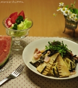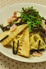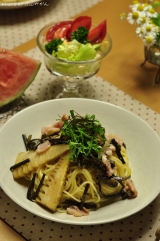 ふるさと21ファンサイト参加中とある日のひとり晩ご飯※義母に顰蹙を買って、一人で晩御飯したわけではありません(コチラ)タケノコと自然薯のパスタベーコンをカリカリにピュアオリーブオイルで炒め、茹でタケノコと自然薯を濃い口しょうゆでサッと加熱し、ゆでたパスタに絡めたら、出来上がりおいしかったー… 2013/04/28