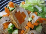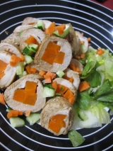 アマタケさんの鶏むね肉(5mmスライス)を使ってくるくる巻きを作ってみましたぁ(嬉)!!! まず、準備として、昨日同様のもみこみます 鶏むね肉(5mmスライス) 5枚 水 50㌘(肉の10㌫) 塩 5㌘(肉の1㌫) 砂糖 5㌘(肉の1㌫) 鶏むね肉全体にフォークで刺し、(水+塩+砂糖… 2012/07/25