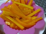 かをりん家、にんじん三昧の日々が続いております♪ にんじんジャム <材料> にんじん 2本 砂糖 80㌘ はちみつ 大匙1 レモン汁 大匙2 <作り方> ①にんじんは、皮つきのまま、すりおろす ②お鍋にすべての材料を入れて、弱火で1520分間、煮詰める ③汁気を飛ばして完成♪… 2012/07/15