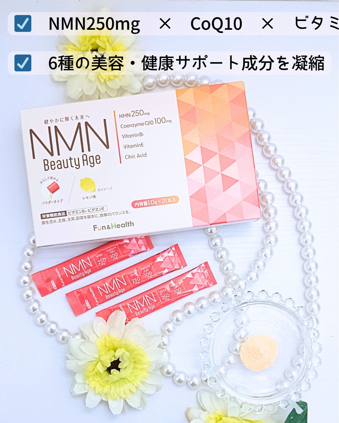 創業30年以上の新日本製薬が、研究を重ね試行錯誤しながら開発した新商品のサプリメント 話題の栄養成分NMN250mgを中心に女性にうれしいコエンザイムQ10などの成分を全6種類を配合したオリジナル設計。 【配合成分】NMN(250mg)、コエンザイムQ10(100mg)、ビタミンB1、ビタミンE、クエン酸、メロングリソディン(原料名) 続けやすさを追求し、「水なし飲める」「個包装タイプでどこでも持ち運びできる」にこだわったパウダータイプのサプリメントです。 クエン酸配合でさっぱりとしたレモン風味だからおいしく続けやすい。