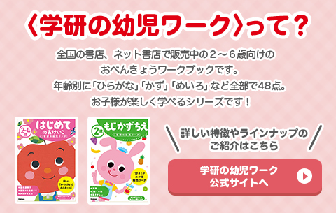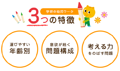 〈学研の幼児ワーク〉は、年齢に合わせて無理なく、あきずに最後までやりとげられるような工夫がたくさん詰まっています。