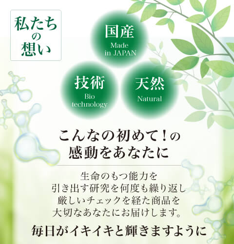 弊社は「国産・天然・技術」にこだわり、新しい発想で独自のバイオテクノロジーと生命の持つ能力を引き出す研究を日々繰り返し、厳しいチェックを経て、皆さまへこだわりの商品をお届けしています。