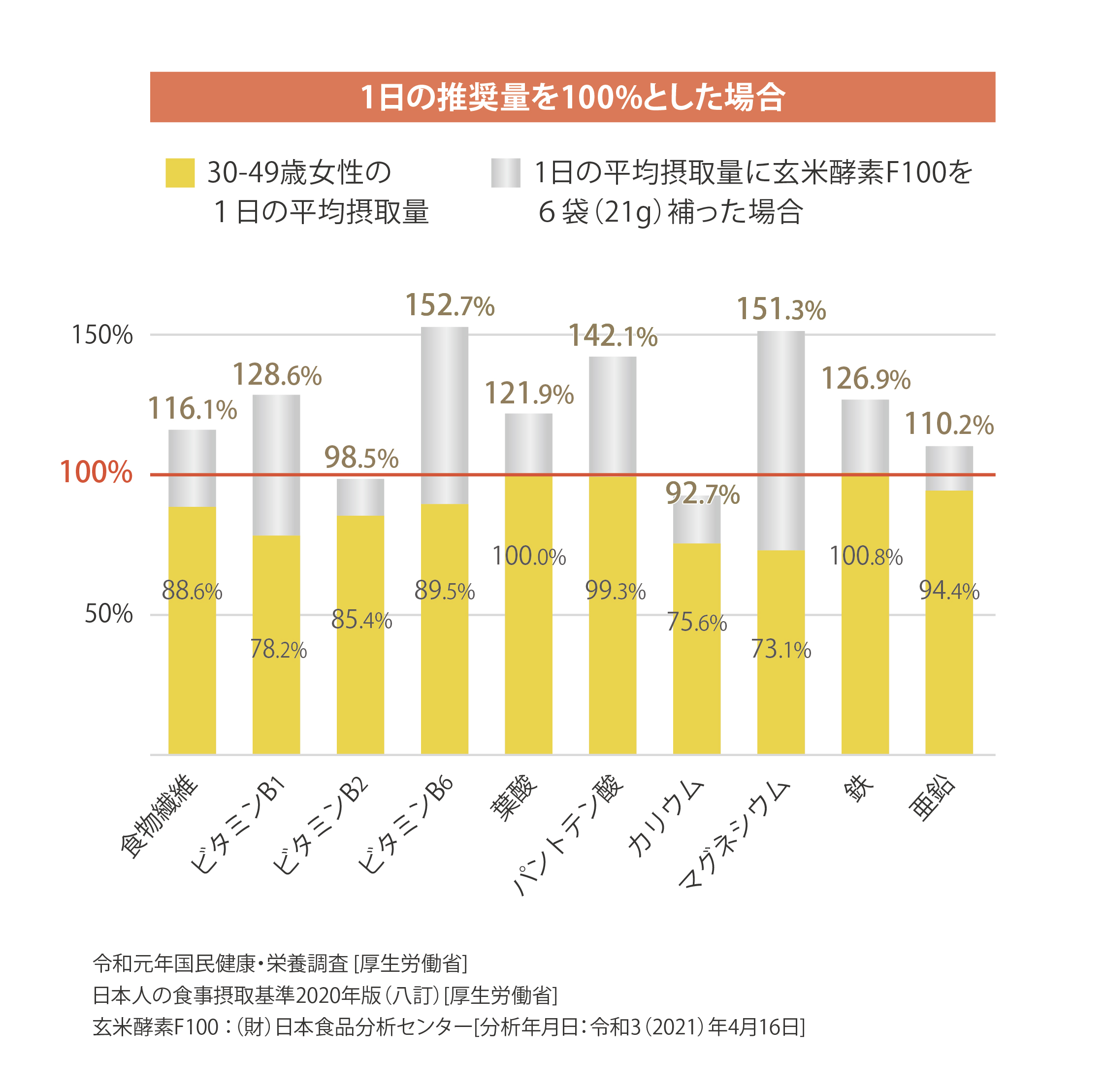 玄米由来の食物繊維、鉄、カルシウム、マグネシウム、亜鉛、ビタミンB1・B2・B6・E、葉酸、パントテン酸、ビオチン、ナイアシンなどが豊富に含まれています。