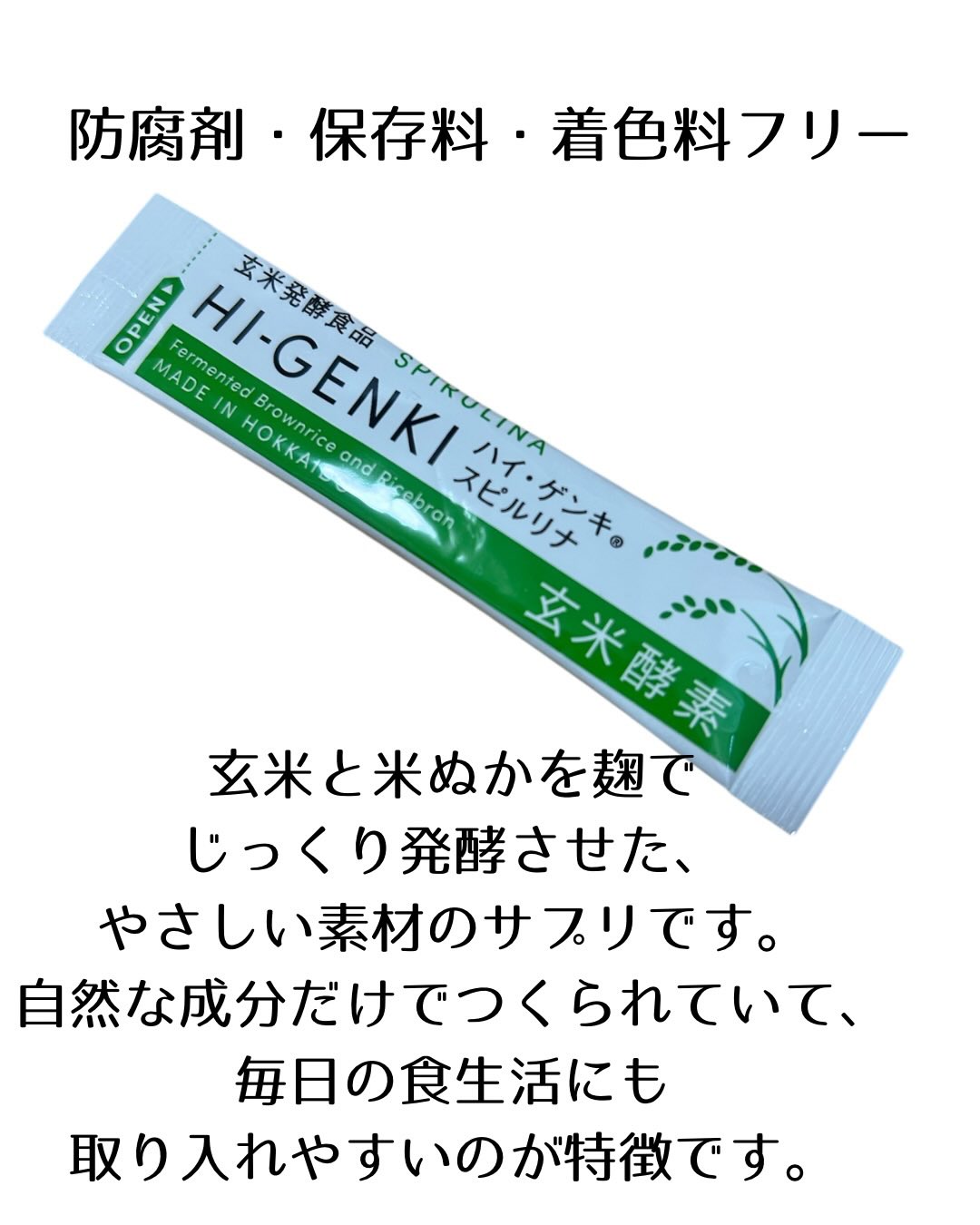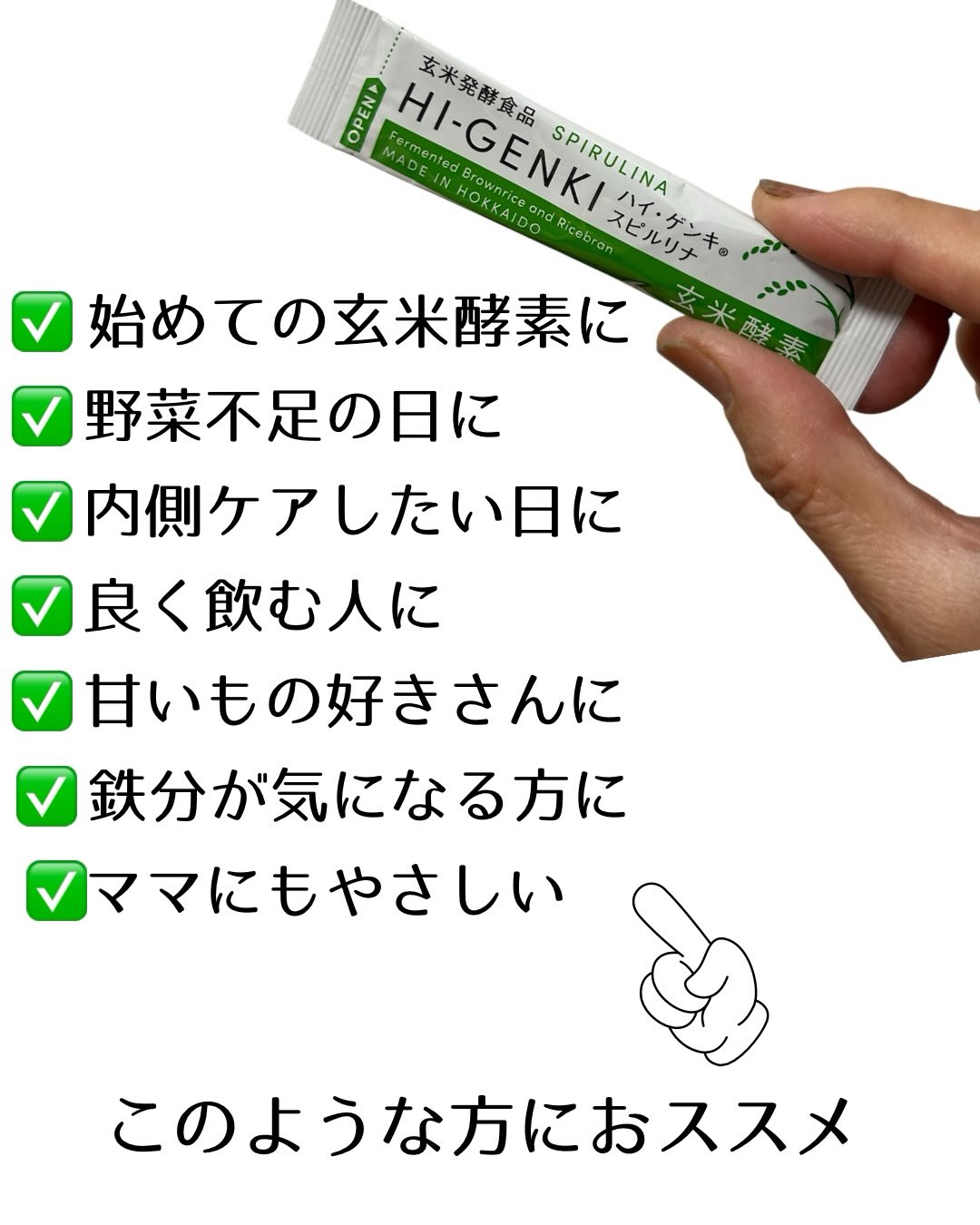 現代人は食生活の偏りにより、ビタミン・ミネラル、食物繊維、酵素などが不足しがち。「玄米酵素」は、そんな皆様の毎日の栄養をサポート! 食物繊維たっぷりで、ビタミンB群やアミノ酸なども豊富。さらに麹菌による発酵で各種酵素が生まれています。健康・美容に必要な栄養素が40種類以上含まれているため、白米を食べていても玄米食以上の栄養をとることができます。 その玄米酵素にスーパーフード【スピルリナ】をプラスしたのが「ハイ・ゲンキ スピルリナ」です。 スピルリナは、β-カロテン、ビタミンB群、鉄分、葉酸、葉緑素、食物繊維、核酸、フィコシアニンなど、50種以上の健康に役立つ成分を含む藻類の一種。クロレラと同じ藻類で、細胞壁が薄く消化吸収がよいのが特徴です。野菜不足の方、お酒が好きな方、鉄分が不足気味の方などにオススメ。 ●315g(3.5g×90袋入)●原材料:玄米胚芽・表皮、大豆、玄米、スピルリナ、麹菌 https://shop.genmaikoso.co.jp/cart_product/Product.aspx?ProductID=0000202
