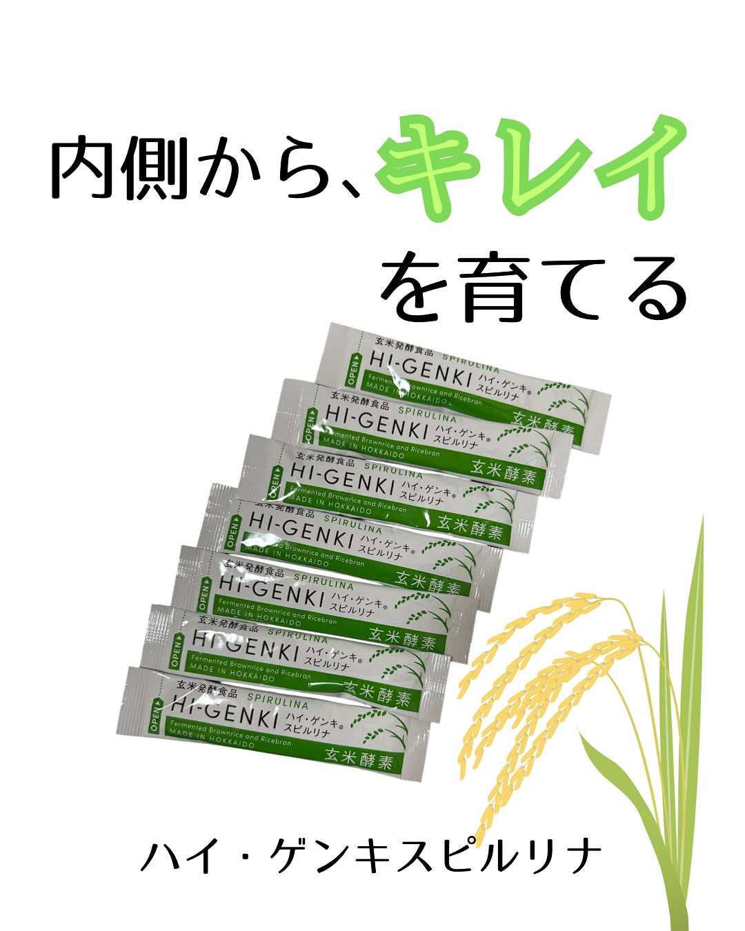 現代人は食生活の偏りにより、ビタミン・ミネラル、食物繊維、酵素などが不足しがち。「玄米酵素」は、そんな皆様の毎日の栄養をサポート! 食物繊維たっぷりで、ビタミンB群やアミノ酸なども豊富。さらに麹菌による発酵で各種酵素が生まれています。健康・美容に必要な栄養素が40種類以上含まれているため、白米を食べていても玄米食以上の栄養をとることができます。 その玄米酵素にスーパーフード【スピルリナ】をプラスしたのが「ハイ・ゲンキ スピルリナ」です。 スピルリナは、β-カロテン、ビタミンB群、鉄分、葉酸、葉緑素、食物繊維、核酸、フィコシアニンなど、50種以上の健康に役立つ成分を含む藻類の一種。クロレラと同じ藻類で、細胞壁が薄く消化吸収がよいのが特徴です。野菜不足の方、お酒が好きな方、鉄分が不足気味の方などにオススメ。 ●315g(3.5g×90袋入)●原材料:玄米胚芽・表皮、大豆、玄米、スピルリナ、麹菌 https://shop.genmaikoso.co.jp/cart_product/Product.aspx?ProductID=0000202
