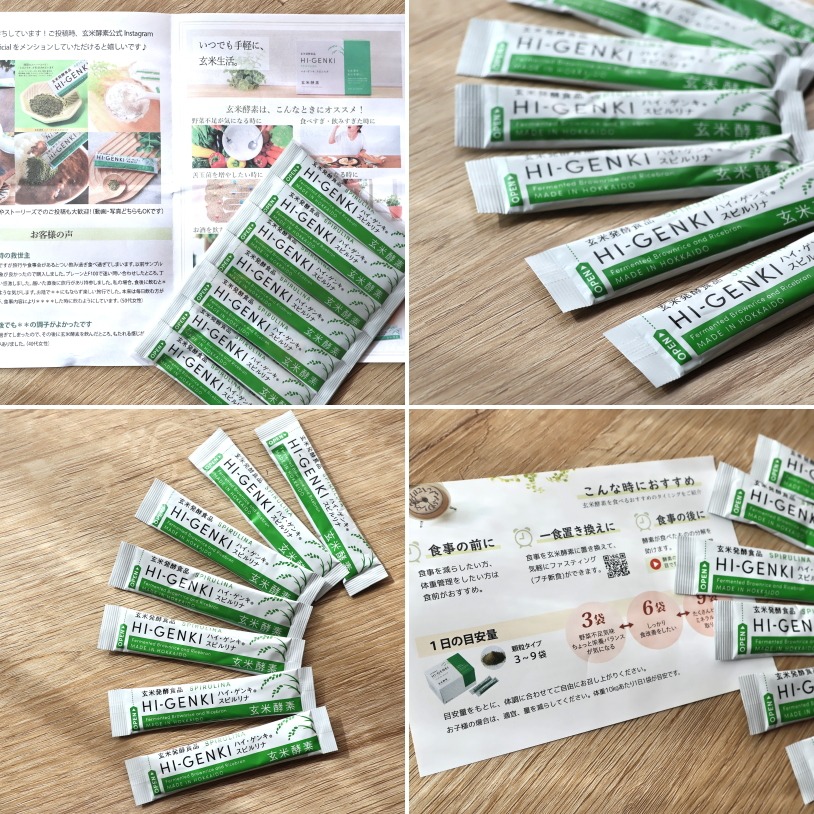現代人は食生活の偏りにより、ビタミン・ミネラル、食物繊維、酵素などが不足しがち。「玄米酵素」は、そんな皆様の毎日の栄養をサポート! 食物繊維たっぷりで、ビタミンB群やアミノ酸なども豊富。さらに麹菌による発酵で各種酵素が生まれています。健康・美容に必要な栄養素が40種類以上含まれているため、白米を食べていても玄米食以上の栄養をとることができます。 その玄米酵素にスーパーフード【スピルリナ】をプラスしたのが「ハイ・ゲンキ スピルリナ」です。 スピルリナは、β-カロテン、ビタミンB群、鉄分、葉酸、葉緑素、食物繊維、核酸、フィコシアニンなど、50種以上の健康に役立つ成分を含む藻類の一種。クロレラと同じ藻類で、細胞壁が薄く消化吸収がよいのが特徴です。野菜不足の方、お酒が好きな方、鉄分が不足気味の方などにオススメ。 ●315g(3.5g×90袋入)●原材料:玄米胚芽・表皮、大豆、玄米、スピルリナ、麹菌 https://shop.genmaikoso.co.jp/cart_product/Product.aspx?ProductID=0000202