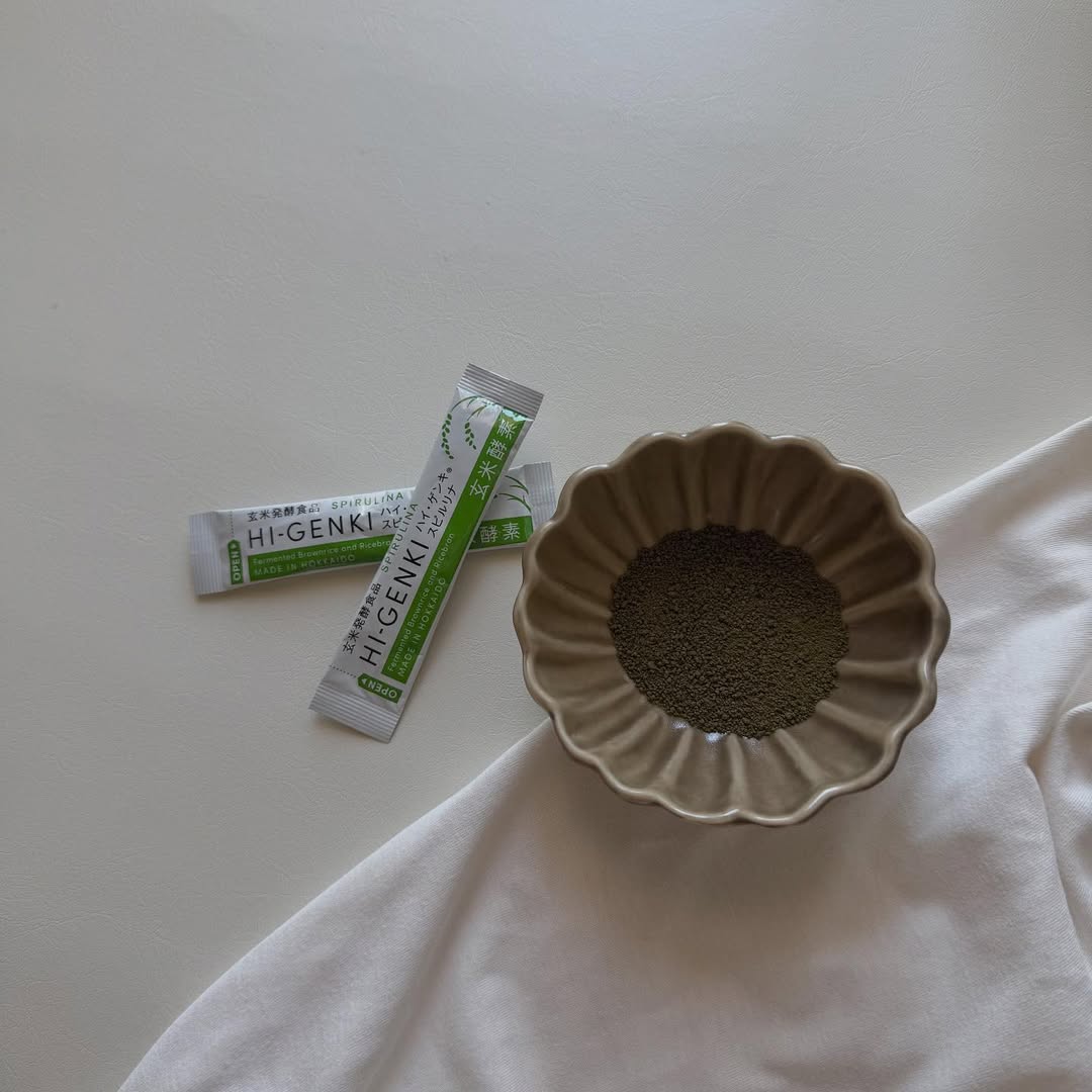 現代人は食生活の偏りにより、ビタミン・ミネラル、食物繊維、酵素などが不足しがち。「玄米酵素」は、そんな皆様の毎日の栄養をサポート! 食物繊維たっぷりで、ビタミンB群やアミノ酸なども豊富。さらに麹菌による発酵で各種酵素が生まれています。健康・美容に必要な栄養素が40種類以上含まれているため、白米を食べていても玄米食以上の栄養をとることができます。 その玄米酵素にスーパーフード【スピルリナ】をプラスしたのが「ハイ・ゲンキ スピルリナ」です。 スピルリナは、β-カロテン、ビタミンB群、鉄分、葉酸、葉緑素、食物繊維、核酸、フィコシアニンなど、50種以上の健康に役立つ成分を含む藻類の一種。クロレラと同じ藻類で、細胞壁が薄く消化吸収がよいのが特徴です。野菜不足の方、お酒が好きな方、鉄分が不足気味の方などにオススメ。 ●315g(3.5g×90袋入)●原材料:玄米胚芽・表皮、大豆、玄米、スピルリナ、麹菌 https://shop.genmaikoso.co.jp/cart_product/Product.aspx?ProductID=0000202