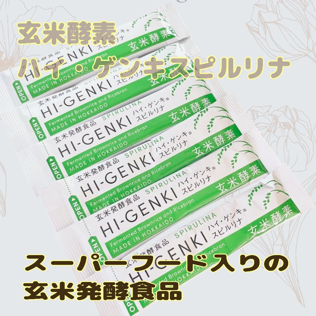 現代人は食生活の偏りにより、ビタミン・ミネラル、食物繊維、酵素などが不足しがち。「玄米酵素」は、そんな皆様の毎日の栄養をサポート! 食物繊維たっぷりで、ビタミンB群やアミノ酸なども豊富。さらに麹菌による発酵で各種酵素が生まれています。健康・美容に必要な栄養素が40種類以上含まれているため、白米を食べていても玄米食以上の栄養をとることができます。 その玄米酵素にスーパーフード【スピルリナ】をプラスしたのが「ハイ・ゲンキ スピルリナ」です。 スピルリナは、β-カロテン、ビタミンB群、鉄分、葉酸、葉緑素、食物繊維、核酸、フィコシアニンなど、50種以上の健康に役立つ成分を含む藻類の一種。クロレラと同じ藻類で、細胞壁が薄く消化吸収がよいのが特徴です。野菜不足の方、お酒が好きな方、鉄分が不足気味の方などにオススメ。 ●315g(3.5g×90袋入)●原材料:玄米胚芽・表皮、大豆、玄米、スピルリナ、麹菌 https://shop.genmaikoso.co.jp/cart_product/Product.aspx?ProductID=0000202