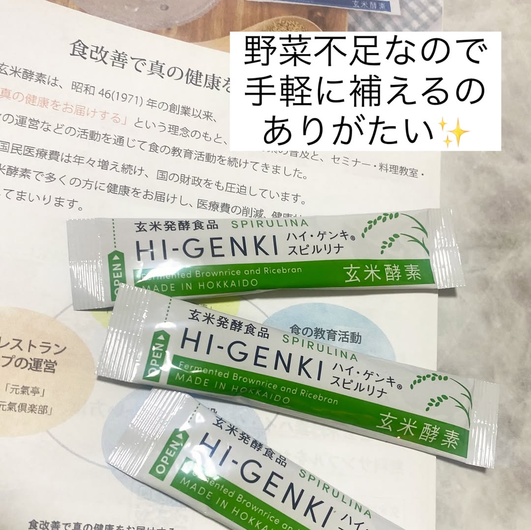 現代人は食生活の偏りにより、ビタミン・ミネラル、食物繊維、酵素などが不足しがち。「玄米酵素」は、そんな皆様の毎日の栄養をサポート! 食物繊維たっぷりで、ビタミンB群やアミノ酸なども豊富。さらに麹菌による発酵で各種酵素が生まれています。健康・美容に必要な栄養素が40種類以上含まれているため、白米を食べていても玄米食以上の栄養をとることができます。 その玄米酵素にスーパーフード【スピルリナ】をプラスしたのが「ハイ・ゲンキ スピルリナ」です。 スピルリナは、β-カロテン、ビタミンB群、鉄分、葉酸、葉緑素、食物繊維、核酸、フィコシアニンなど、50種以上の健康に役立つ成分を含む藻類の一種。クロレラと同じ藻類で、細胞壁が薄く消化吸収がよいのが特徴です。野菜不足の方、お酒が好きな方、鉄分が不足気味の方などにオススメ。 ●315g(3.5g×90袋入)●原材料:玄米胚芽・表皮、大豆、玄米、スピルリナ、麹菌 https://shop.genmaikoso.co.jp/cart_product/Product.aspx?ProductID=0000202