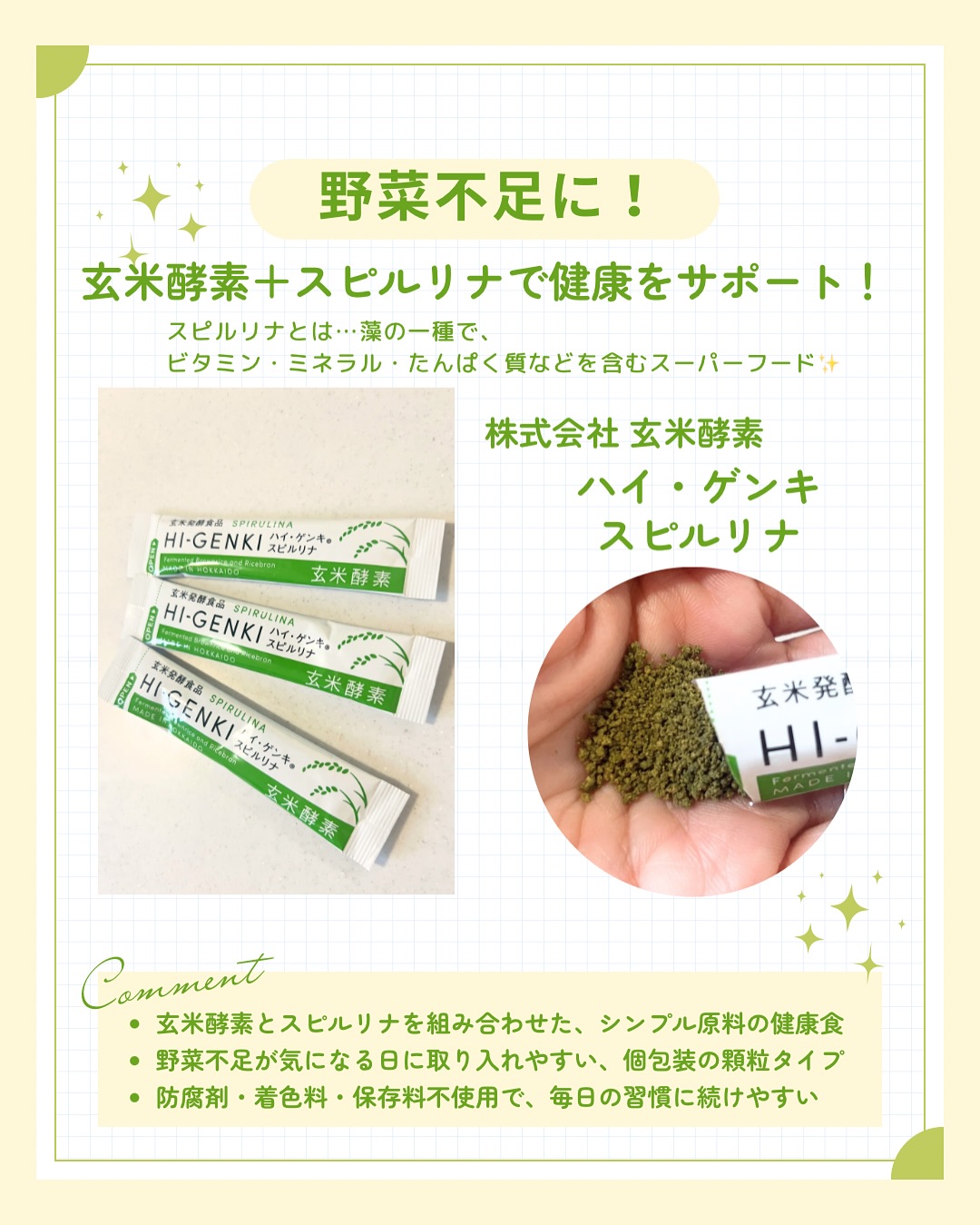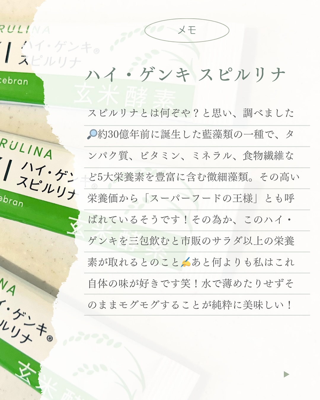 #PR #株式会社玄米酵素 #食べ過ぎ #お腹ぽっこり #体重管理 #食物繊維 #健康習慣 #monipla #genmaikoso_fan ハイ・ゲンキ スピルリナを試してみました🌱 玄米酵素に「スピルリナ」という藻由来のスーパーフードが入ったタイプで、 食生活がちょっと偏りがちな日のお守りとして取り入れやすい健康食品です。 スピルリナは、ビタミン・ミネラル・たんぱく質などが含まれていて、 “野菜をなかなか食べられない日にも摂りやすい素材”として知られているみたい🌿 個包装で持ち運びやすく、私はそのまま飲んでも大丈夫な味でした◎ というか美味しい!笑 #ハイゲンキ #玄米酵素 #スピルリナ #インナーケア #健康食品レビュー #栄養補助食品 #野菜不足 #食生活改善 #健康習慣 #腸活 #アラサー女子 #健康オタク