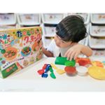 お米でできた安心素材のねんど5色とフライパンや鍋、まな板などのキッチンツールが入ったセットです。粘土で作ったニンジンを切ったり、フライパンや鍋におかずを入れてみたり、楽しくままごとあそびができます。
