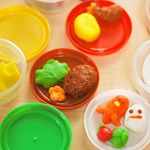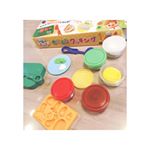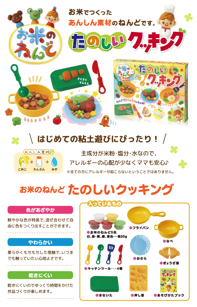 お米でできた安心素材のねんど5色とフライパンや鍋、まな板などのキッチンツールが入ったセットです。粘土で作ったニンジンを切ったり、フライパンや鍋におかずを入れてみたり、楽しくままごとあそびができます。