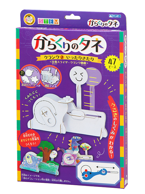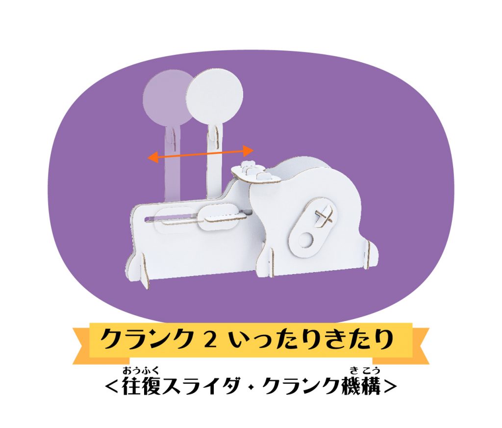 「クランク2 いったりきたり」では、「クランク機構」を作ることができます。手を使って組み立て、自分で動かしてみることで、小さなお子さまでも工学のおもしろさを体験をすることができます。