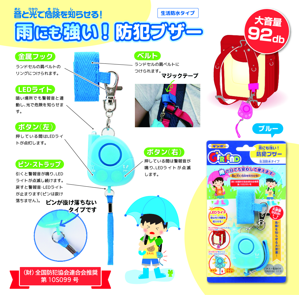 雨の日でも安心して使える生活防水タイプの防犯ブザーです。