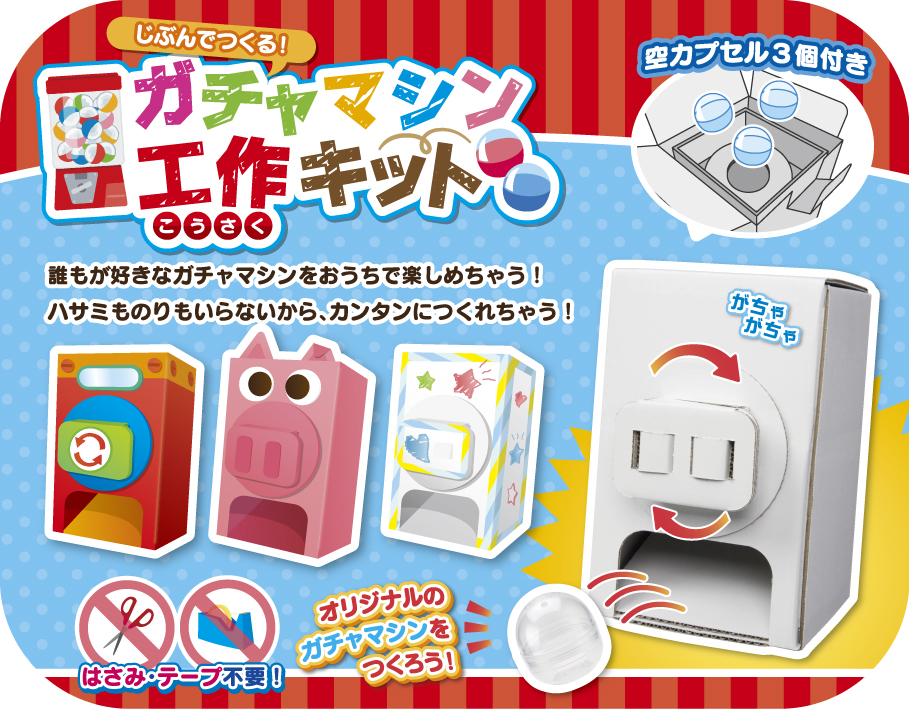 おうちでガチャ遊びができる! オリジナルのガチャマシンが作れる工作キットです。 デコレーション用の道具・材料は付属しません。