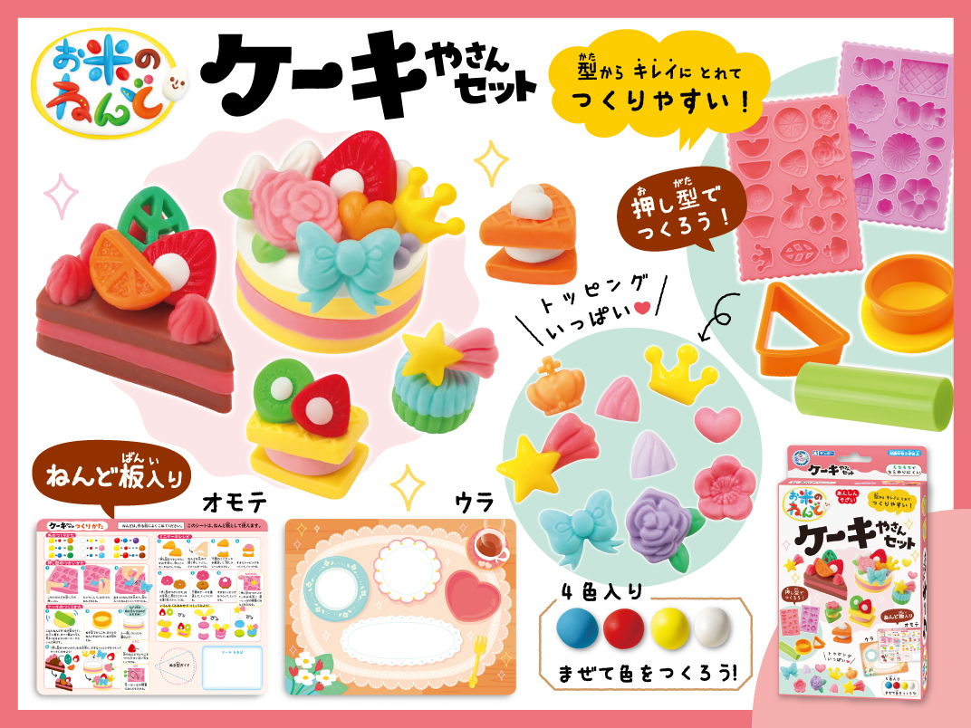 お⽶のねんどで遊んで作れる「お⽶のねんど ケーキやさんセット」がリニューアル!パッケージが新しくなって、紙製のねんど板(両⾯)も追加されました。
