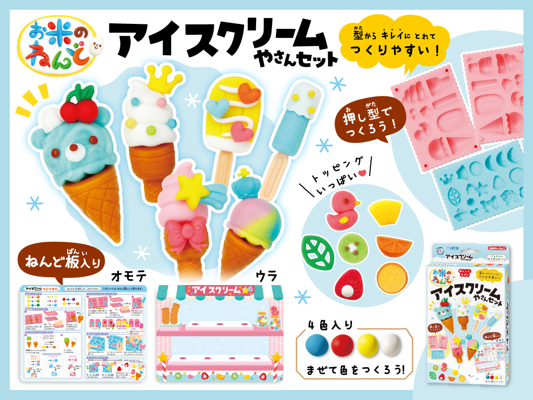 お⽶のねんどで遊んで作れる「お⽶のねんど アイスクリームやさんセット」がリニューアル!パッケージが新しくなって、紙製のねんど板(両⾯)も追加されました。