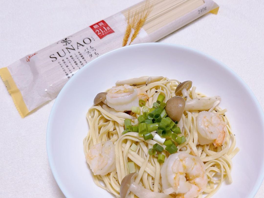【グリコ「SUNAO パスタ」】 240g(80g×3食) デュラム小麦粉に、もち大麦粉などのこだわり原料を配合し、食物繊維をたっぷり加えることで、糖質量を調節しながら、もっちり食感を実現。 平打ち麺にすることでソースがよく絡む味わい深いパスタに。 GW9連休中の夕食に中華風パスタを作って食べたよ。 材料はほかに、海老、しめじ、小ネギ、にんにく、ゴマ油、鶏がらスープの素、塩、胡椒。 本当にもっちりしていて美味しいパスタ。 糖質が気になるので、この食べ応えで糖質量1食21.1gまでコントロールできるのは嬉しいです。 #江崎グリコ #グリコダイレクトショップ #SUNAO #SUNAOパスタ #適正糖質 #糖質 #Glico_PR #糖質60パーセントオフ #中華風パスタ #monipla #glico_fan #PR #おうちごはん #おうち時間 #時短レシピ #簡単レシピ #パスタ