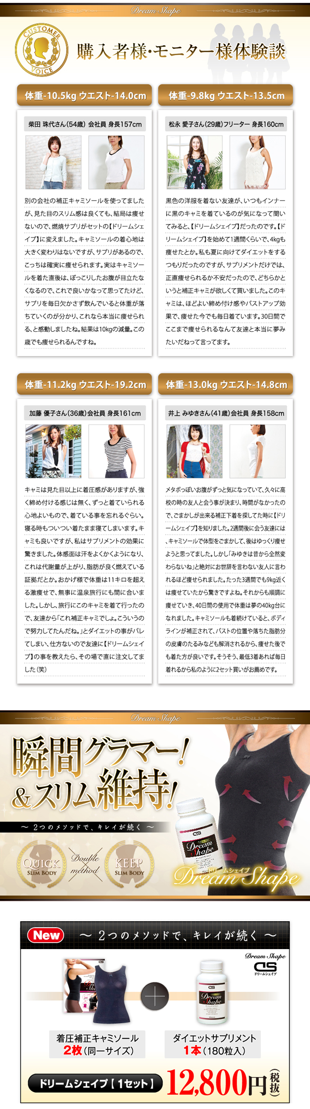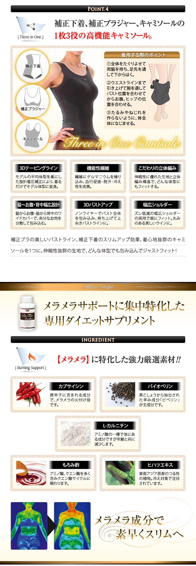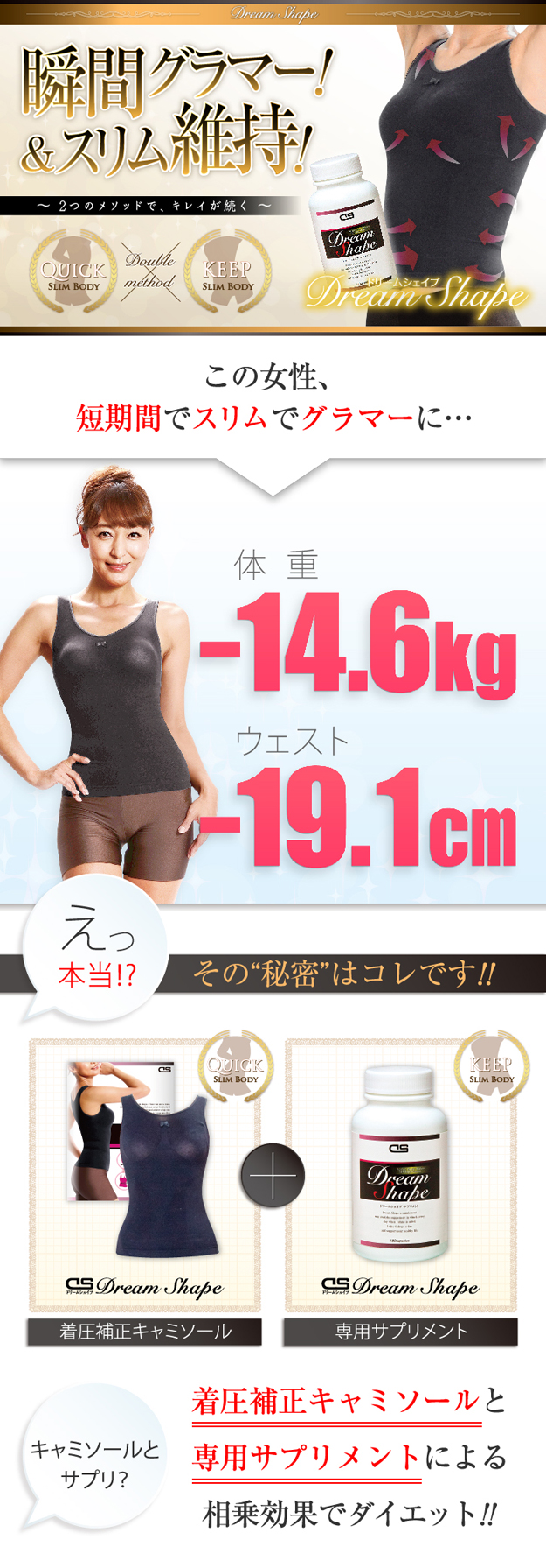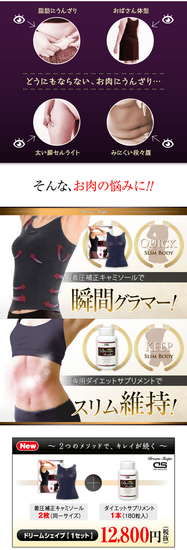 着圧補正キャミで瞬間シェイプ+ 脂肪燃焼サプリで永続シェイプ 【ドリームシェイプ】は 補正キャミとダイエットサプリのセットです! どうにもならない脂肪にうんざりの方へ…。