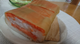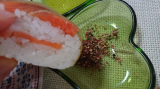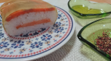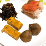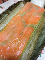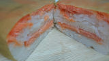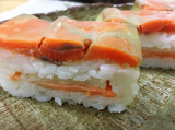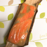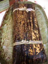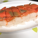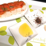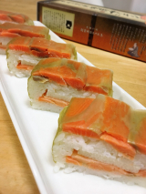 鳥取県境港で育ち、適度に脂がのった「境港サーモン」を新鮮なうちに活き〆し、香り高い特製ブレンドビネガーに漬け、桜チップで軽くスモークしました。その背身を鳥取県産米の酢飯にのせて白板昆布で巻き、さらに中段には、腹身と二十世紀梨の地酒で煮た砂丘長芋をはさんだ、贅沢な吾左衛門鮓です。手間を惜しまぬ製法で、深い味わいを追求しました。