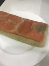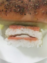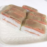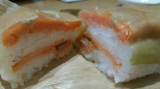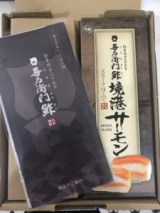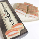 鳥取県境港で育ち、適度に脂がのった「境港サーモン」を新鮮なうちに活き〆し、香り高い特製ブレンドビネガーに漬け、桜チップで軽くスモークしました。その背身を鳥取県産米の酢飯にのせて白板昆布で巻き、さらに中段には、腹身と二十世紀梨の地酒で煮た砂丘長芋をはさんだ、贅沢な吾左衛門鮓です。手間を惜しまぬ製法で、深い味わいを追求しました。