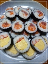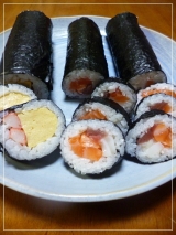 2日遅れましたが 何とか作りました23日少しだけ体調が思わしくなかったのでいつでもいい 他の日に作ればいい と思ったのですが 長年作っているだけに 作らないと気が済まなくて生ものが大好きなので イカ、サーモン、マグロ巻き(サーモンだけ購入)サラダ巻きにはカニカマと でかすぎる出汁巻でごまかしまし… 2015/02/05