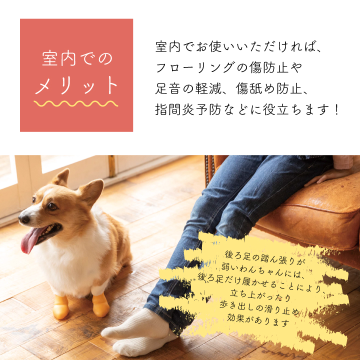 屋外でもお使いになれるのでお散歩にも履いていけます。夏は熱いアスファルトから、冬は冷たい雪や冬道から、わんちゃんの肉球をしっかり守ります。