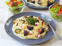 『わさび風味こんぶ茶』を使って「茄子とタコの冷製パスタ」です。