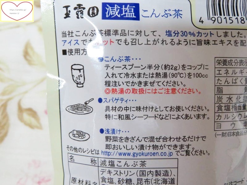 #PR #玉露園 #減塩こんぶ茶 #玉露園のこんぶ茶 #monipla #gyokuroen_fan 我が家の大好きな玉露園さんの商品の紹介です。 ★減塩こんぶ茶★ カルシウムやヨウ素などのミネラル分を豊富に含んでいるヘルシーなこんぶ茶で美味しいです。 減塩タイプなので塩分が気になる人にもおススメです。 ホットでもアイスでも美味しく手軽に飲める。 粉末タイプでサっと溶けるから使いやすいです。 こんぶ茶は牛乳や豆乳等との相性がとても良いです。 お酒を飲む人には焼酎のこんぶ茶割りやこんぶ茶サワーもおすすめ。 昆布の良いお出汁もきいていて、減塩ですから身体に良くて美味しいです。 減塩こんぶ茶は料理の隠し味にもぴったり~。 調味料にもぜひ! 切り干し大根との相性もバッチリで風味豊かで良い出汁が出て美味しい! 夏もこんぶ茶、ぜひキンキンに冷やして飲んでみてください。 汗をかくと水分とともに塩分も身体から出ていきます。 体内の塩分が減ると、体内の水分をとどめる働きが弱くなってしまいます。 そのため熱中症を予防するためには、水分だけでなく塩分を一緒に摂ることがポイントです。 秋田いなふく米菓様とのコラボ商品として、食べきりサイズのぬれ小餅「玉露園梅こんぶ茶味」を好評発売中! 他にもこんぶ茶には様々なコラボ商品がありますので、ぜひお試しくださいね。