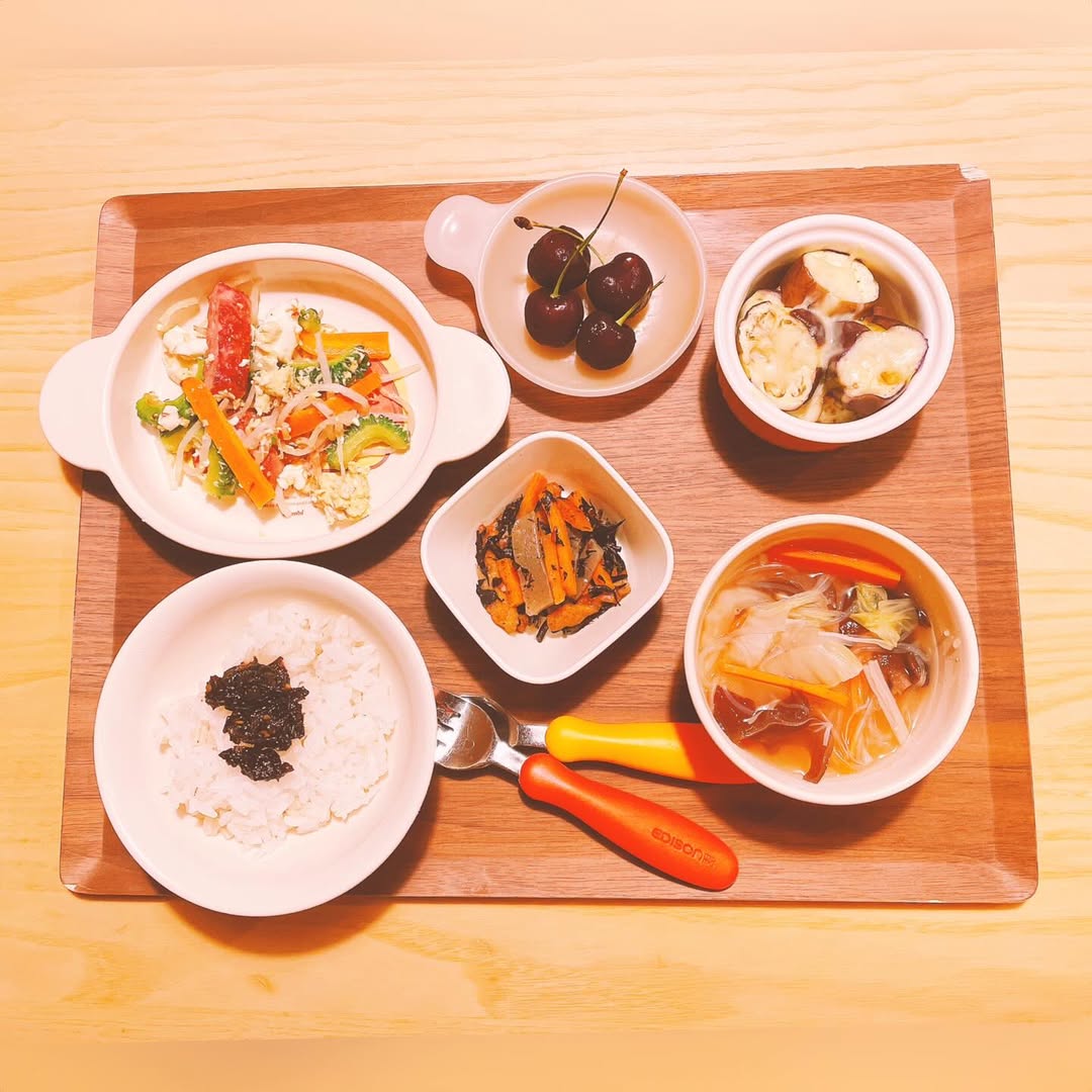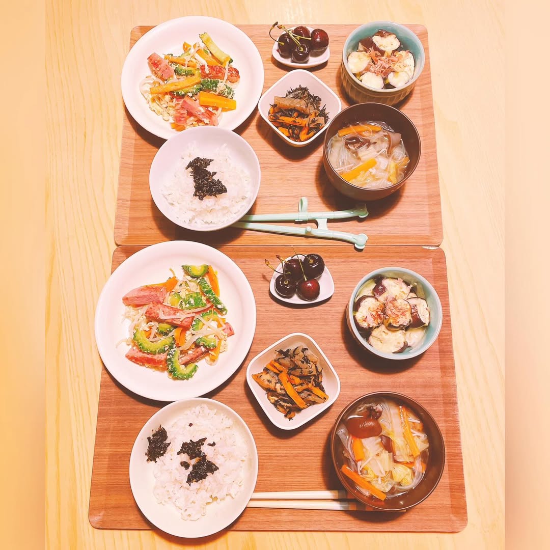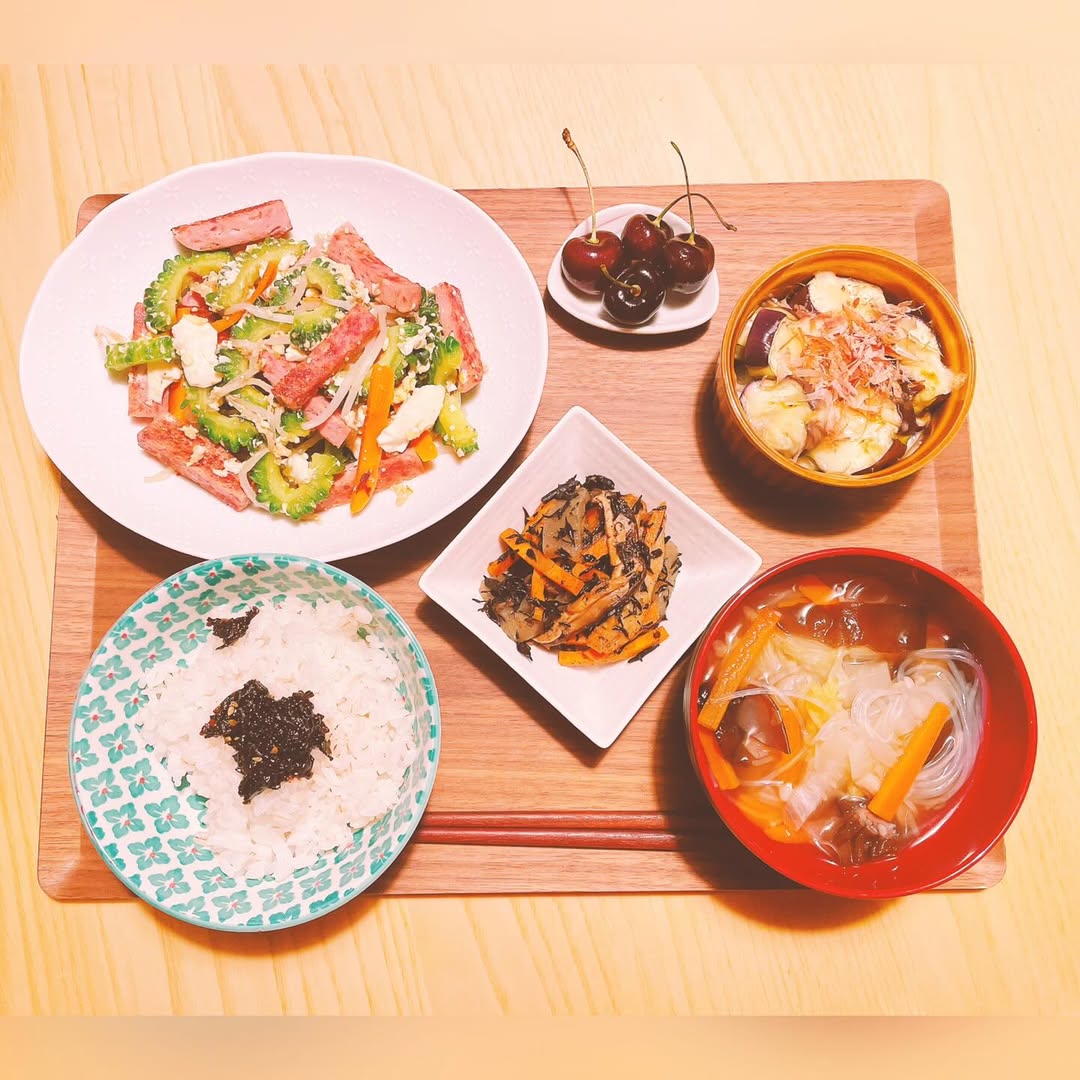 今日の夜ご飯🍽️ メインは、ゴーヤチャンプル☀️ この夏初めてのゴーヤ美味しかったー😋子どもたちは、ゴーヤはちょっと苦手みたいだけど、スパム大好きだから、一緒だとパクパク完食してくれます😁今日のゴーヤチャンプルは、 @monipla.jp さまのキャンペーン提供頂いた@gyokuroen さまの #減塩こんぶ茶 を使って作りました🎵 シンプルに作るゴーヤチャンプルが好きで、我が家はいつもこんぶ茶+醤油に鰹節だけで味付け♡♡ 減塩だからたっぷり使えて、昆布の旨みが引き立って美味しかった😋 この夏のゴーヤチャンプル作りに愛用させて頂きます😍 ・ #PR #玉露園 #減塩こんぶ茶 #玉露園のこんぶ茶 #monipla #gyokuroen_fan ・ #お家ご飯 #子どもご飯 #大人ご飯 #男の子ママ #幼児食 #7歳ご飯 #5歳ご飯 #2歳ご飯 #子どものいる暮らし #おうちごはん #ご飯記録 #今日の夜ご飯 #一汁三菜 #料理好きな人と繋がりたい #三兄弟ママ #保育士ママ #ワーママ #夜ご飯メニュー #ゴーヤチャンプル #ひじき煮 #茄子のチーぽん焼き #春雨スープ #もち麦ごはん #アメリカンチェリー