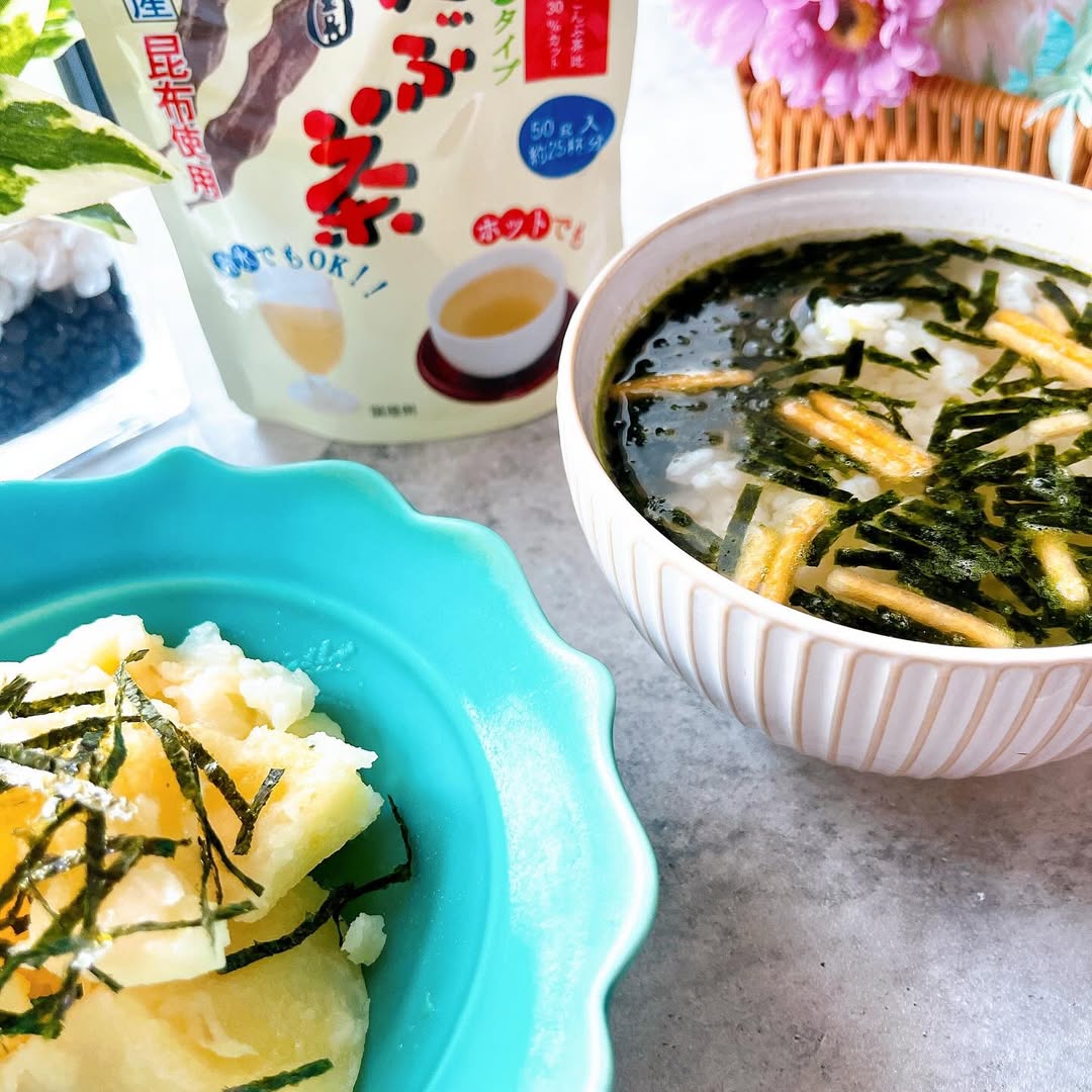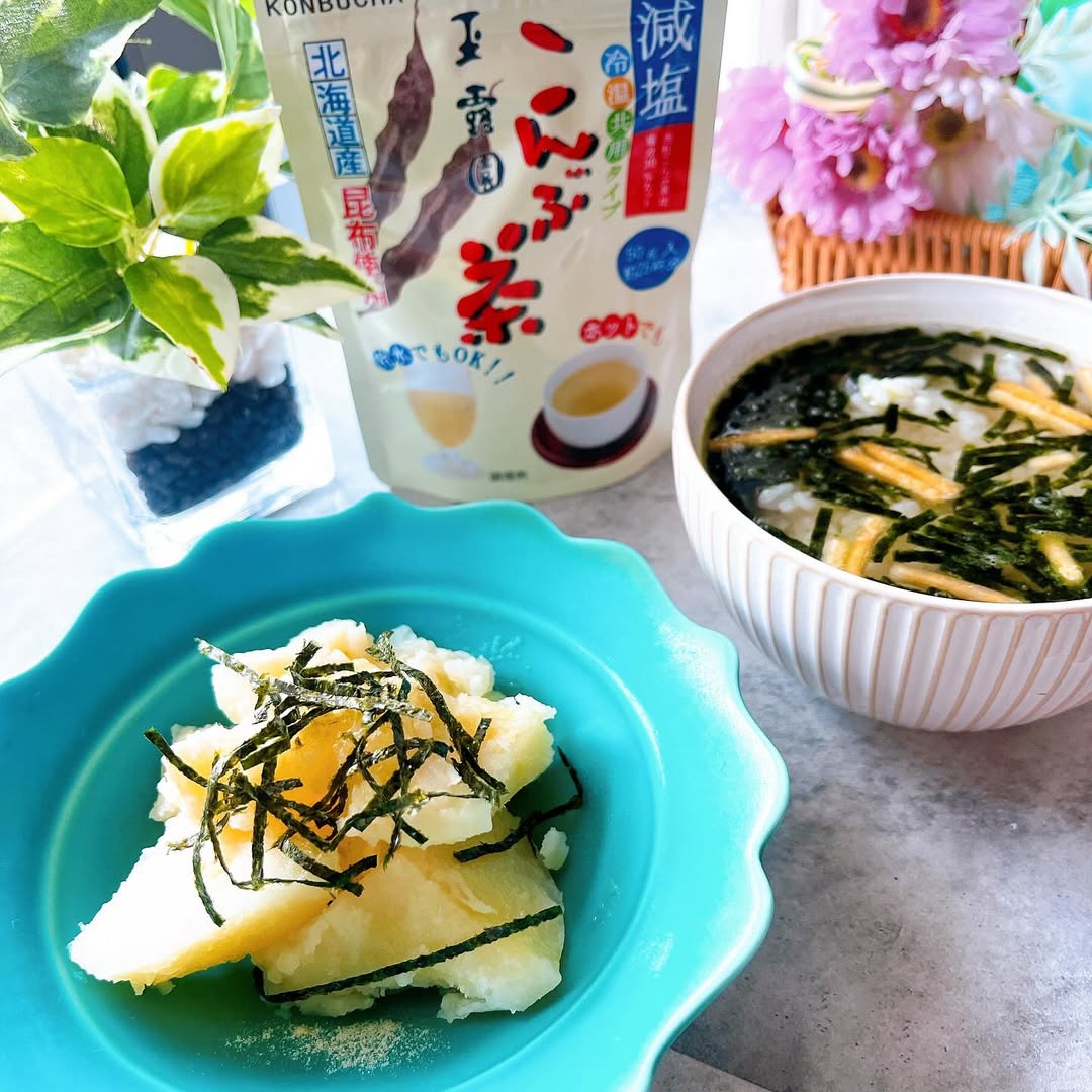 ホットにも冷水でも飲みやすいように開発された 『減塩こんぶ茶』🍵 暑いので『減塩こんぶ茶』は熱中症対策にも有効です🥵 『減塩こんぶ茶』は、塩分を30%カットしながら カルシウムやヨウ素などのミネラル分を豊富に含んでいるヘルシーなこんぶ茶🍵 減塩タイプなので塩分が気になる人にもおススメ💯 こんぶ茶を料理の調味料としても使いました✨ お茶漬けにしたり、蒸したじゃがいも🥔にバターと 昆布茶にきざみのりかけた一品など✨ 粒子も細かいので、お料理に使いやすかったです✨☺️ #PR #玉露園 #減塩こんぶ茶 #玉露園のこんぶ茶 #monipla #gyokuroen_fan