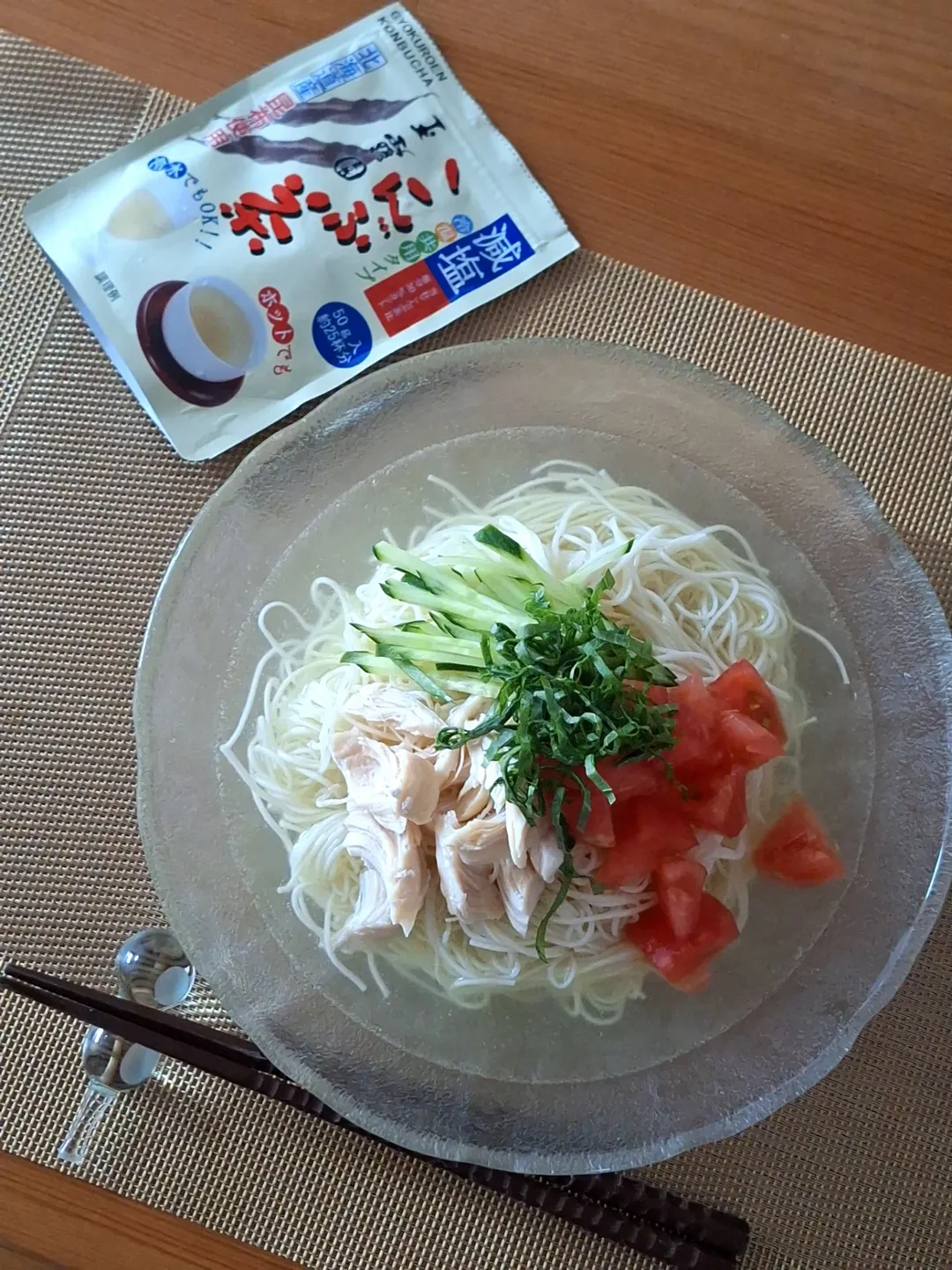 . こんぶ茶の冷やしそうめん 梅雨はあけたものの今日も夕立ちに雷⚡ 湿度が高く蒸し暑い日々😵💦 こんな日のお昼は火を使わずに、さっぱりと冷やしそうめん 鶏ささみは塩コショウして少しお酒を振りかけてレンチン。粗熱がとれたら手で割いておきます。 その間にきゅうり、トマト、大葉を切って そうめんもお湯を沸かして浸すだけで茹でませんよ! お湯に浸して1~2分程で冷水にとってぬめりをとるように擦り洗いし、器に冷水で濃いめに溶いたこんぶ茶の中へ。 具材をトッピングしたら、もう出来上がり♪ 器に冷水を入れてからこんぶ茶を降り入れて混ぜたら、さっと溶けてダマになることもありません👍 味つけがこんぶ茶だけでは物足りない人は、ほんの少しめんつゆやぽん酢またはお酢を落としても◎ 私は途中でお酢を落として味変💠 こんぶ茶とトマトの旨みの相乗効果に、さらにさっぱりと食が進みます😊 #PR #玉露園 #減塩こんぶ茶 #玉露園のこんぶ茶 #monipla #gyokuroen_fan @gyokuroen #おうちごはん #おうちランチ #冷やしそうめん #こんぶ茶の冷やしそうめん #そうめんレシピ #火を使わないレシピ #こんぶ茶レシピ #簡単レシピ #簡単アレンジ #アレンジレシピ #夏レシピ #暑い日にオススメ #暮らしを楽しむ #おうちごはんlover
