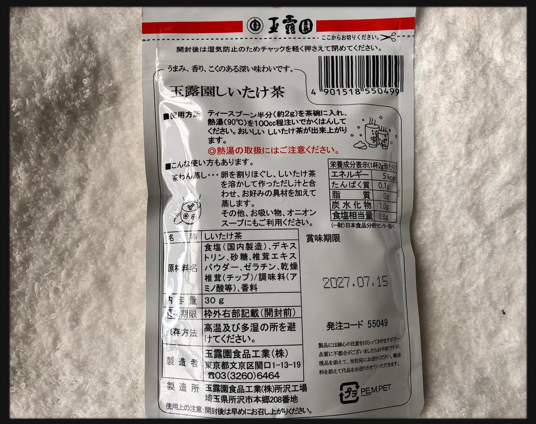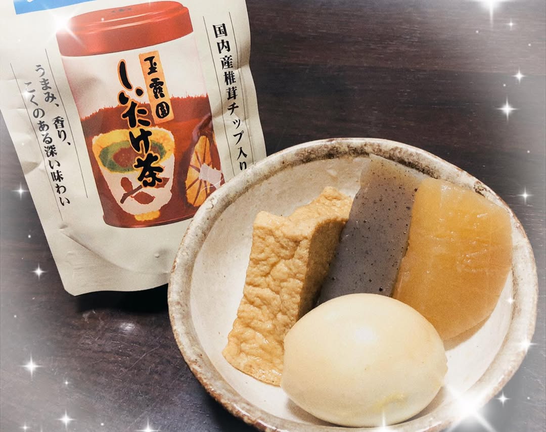 ☆☆〜☆☆〜☆☆〜☆☆〜☆☆〜☆☆ 玉露園食品工業株式会社 玉露園しいたけ茶 内容量 30g ☆☆〜☆☆〜☆☆〜☆☆〜☆☆〜☆☆ 以前は、こんぶ茶を飲んで癒しを頂きました。 今回は、しいたけ茶をお試ししました。 こちらは、 乾しいたけを特殊製法で微粒状にして、 しいたけの持味を十分に生かした飲みもの とのこと。 袋の中には、椎茸の香りを感じる粉末に 国内産椎茸チップが入っていますね。 先ずは、飲用として頂いてみました。 ほんのりと黄金に輝く様な色合いです。 香りも、旨みも、しっかりと椎茸を感じられて、 出汁が効いてて美味しいです。 そして、飲用だけではもったいないので、 お出汁として使ってみたのが、おでん。 最近はグッと冷え込みを感じてきてますから、 夜は暖かなおでんにしました。 おでんの他にも、茶碗むしやお吸いものなど 様々な料理にも使えそうですね。 うま味とたっぷりの栄養成分が 手軽にとれるしいたけ茶をお料理でも 使っていこうと思いました。 ・ #PR #玉露園 #しいたけ茶 #玉露園しいたけ茶 #monipla #gyokuroen_fan