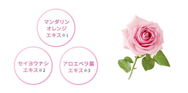 ※1 マンダリンオレンジ果皮エキス(皮膚コンディショニング成分) ※2 乳酸桿菌/セイヨウナシ果汁発酵液(皮膚コンディショニング成分) ※3 皮膚コンディショニング成分