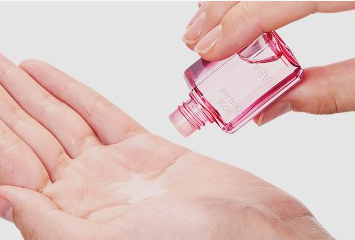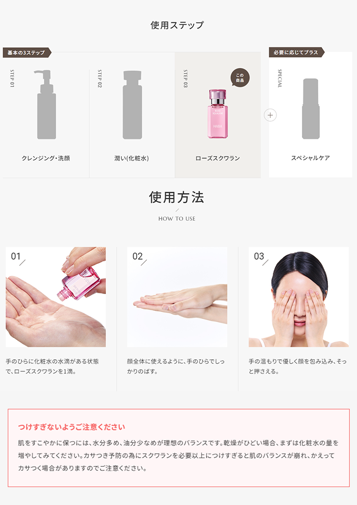 使い方は、手のひらに化粧水の水滴がある状態で、スクワラン*を1滴**加え、顔全体に使えるように、手のひら全体にしっかりのばして、手の温もりで優しく顔を包み込んでそっと押さえるように前顔になじませる。