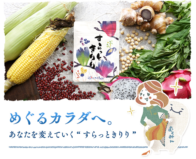 私たちの体は、血液の中の余分な水分や老廃物を体の外に出し水分量のバランスを保っています。 しかし、なんらかの理由でめぐりが悪くなり、水分や老廃物をスムーズに排出できず体の中に溜まってしまうと、顔や足などがパンパンになってしまいます。 特に女性は、筋肉の量が少ないことや体の月のサイクルの影響もあり、パンパンになりやすいと言われています。 すらっときりりは、厳選した自然素材で、「めぐるカラダ」へあなたを導きます。
