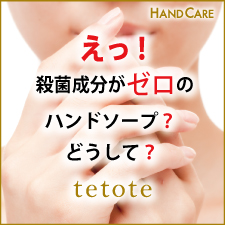多くの薬用石けん、ハンドソープは合成界面活性剤のタンパク質変性作用で殺菌します。しかしこれは同時に皮膚のタンパク質をも変性させ、ターンオーバーの乱れを引き起こす心配があります。そのためtetote HandSoap(ハンドソープ)は殺菌、除菌成分は使用しておりません。