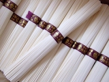 はりま製麺の「揖保乃糸 縒つむぎ(ひね) 38束入」を食べてみました箱を開けると、中にはそうめんがいっぱい!小麦粉のいい香りが漂ってきます「縒(より)つむぎ」は国内産の小麦だけを使い、絹のように輝く細さに仕上げたもので、もちもちとした食感と小麦本来の風味が特長なのだそう帯はとってもきれいな紫色で… 2012/04/22