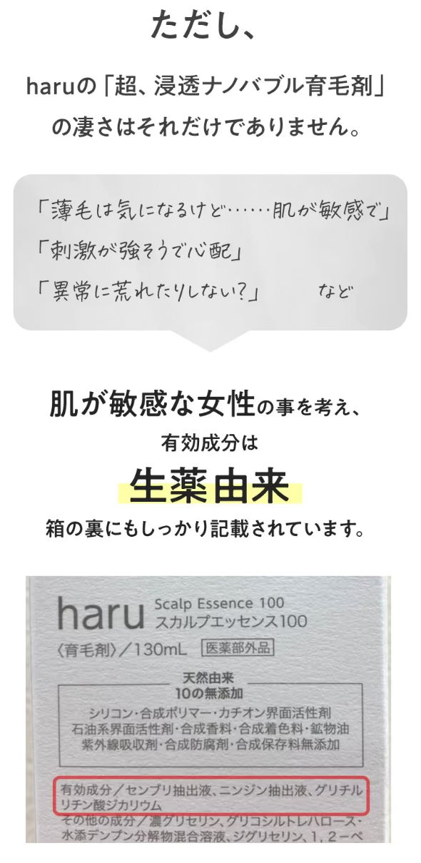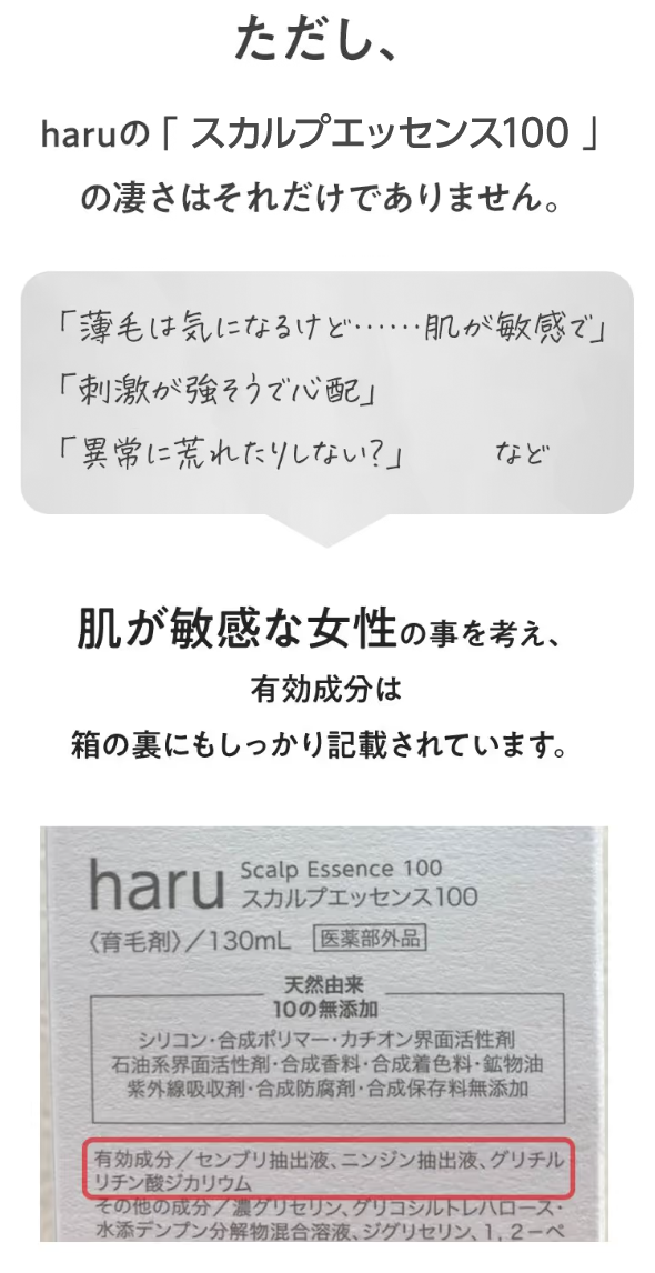 ※1:ニンジン抽出液(頭皮環境を整え発毛を促進)、センブリ抽出液(血流を促進し発毛を促す)、グリチルリチン酸ジカリウム(肌荒れを防いでフケ、かゆみを抑える)