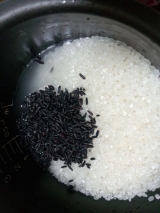 ①洗米したお米1合に対して、黒米大さじ1杯を加えて通常どおり炊飯してください。